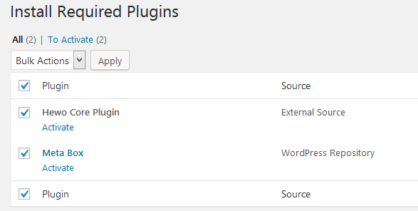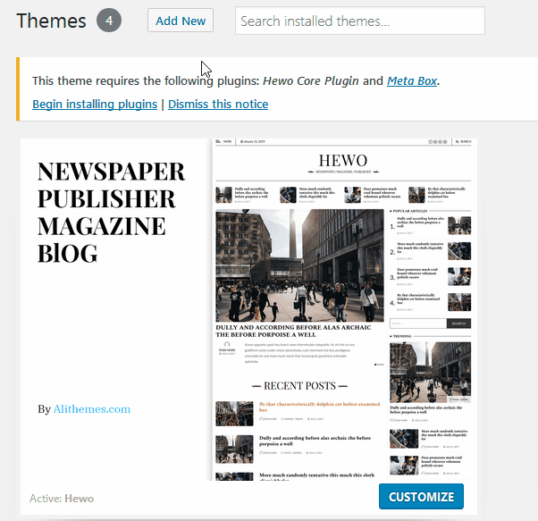 After activating the theme, you will see a notice to install plugins. This theme need Hewo Core and Metabox plugin. Without these plugins, the theme can not function fully. (Important !)
