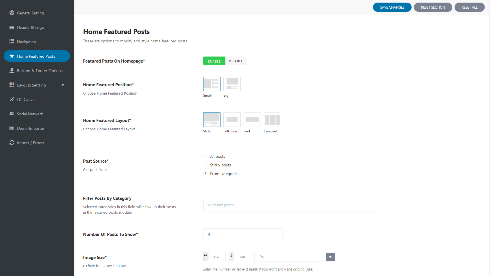 And we have 4 types of featured posts display: Slider, Full slide, Grid, Carausel