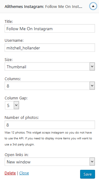 This widget will show the latest image from your instagram site. Just enter your instagram account name.