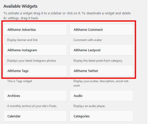 Go to Theme > Widgets, in addition to the default WordPress widgets, Hewo has 6 custom widgets: